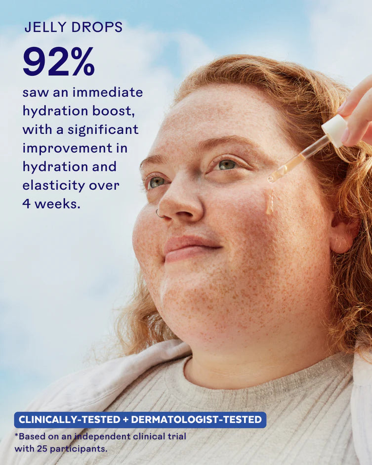 Jelly Drops Mushroom Hyaluronic Acid + Vitamin C Serum: Apply 1-2 drops to clean skin, morning and night. Should be applied after cleansing and before creams. If used once per day, the average customer re-purchases a bottle after 2 months.
